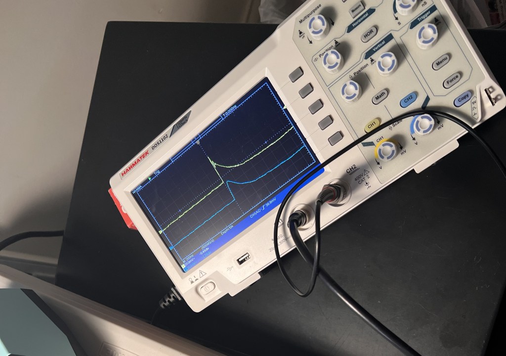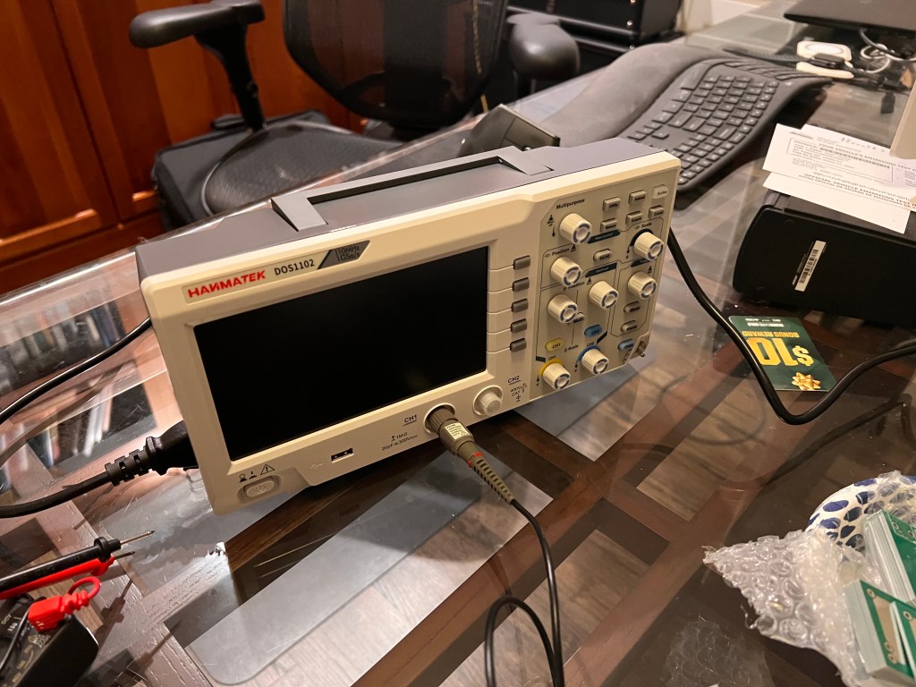 Got an oscilloscope today! A basic, starter one from Amazon. Pretty reasonable, the Hanmatek DoS1102. I have no idea how to use it though, and the manual is not very helpful.