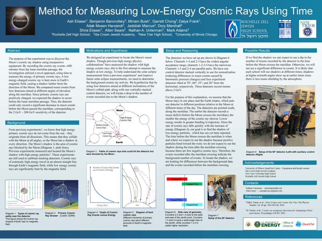 I got involved with a physics research team looking for the muon shadow cast by the moon. Under leadership of Prof. Mark Adams and Nathan Unterman, the team searched for the moon’s moon shadow utilizing 5 detectors located across 3 different high schools. Flux measurements were taken for 15 months with focus on counts before and after the moon meridian. I personally analyzed ~200 million data points!